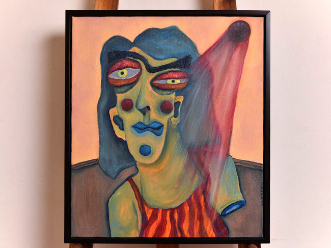This highly stylized and expressively colored oil portrait captures a figure immersed in a state of acute psychological tension and self-awareness, embodying the feeling of being exposed to intense scrutiny. The composition focuses on a central head and shoulders, depicted with exaggerated, almost grotesque features and a vivid, unconventional color palette.The concept explores the anxiety of public gaze and the fracturing of identity under pressure.