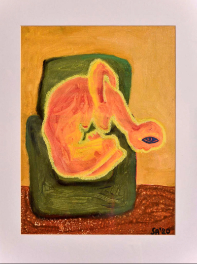 This highly kinetic and vibrantly colored abstract piece uses the unpredictable flow of media to create a powerful image of fiery birth, visceral protection, and primal energy. The composition is dominated by a symmetrical, Rorschach-like pattern of intense reds, oranges, and yellows, suggesting a central biological or spiritual form.The concept explores the title, embodying the ‘Womb’ as a source of intense, transformative creation, where ‘Light’ is the emergent life force.
