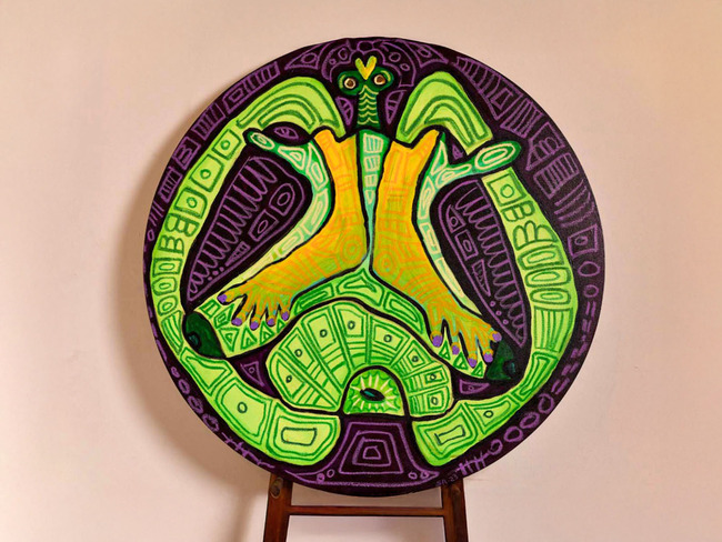 This striking circular artwork captures a powerful sense of primal energy, cyclical renewal, and transformation, utilizing a dense field of contrasting colors and stylized, organic forms. The composition features a central, symbolic figure of two stylized feet and lower legs, rendered in orange-yellow with linear markings, positioned within concentric rings of deep purple and vibrant green.The concept explores themes of birth, metamorphosis, and the grounding of the spiritual self.