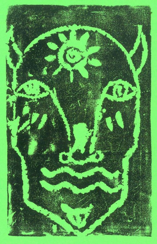 This striking linocut offers a bold, graphic exploration of identity and ancient mythology, rendered in the strong, textural black-and-white contrast characteristic of the medium. The composition is dominated by a central face, stylized to appear both primitive and highly symbolic.The artist has carved a visage that appears to fuse human and elemental features. Symbolism is key: the forehead is marked by a radiating solar motif containing a small eye, suggesting divine insight or a celestial presence. The mouth is replaced by three stylized, wavy lines, which evoke water, speech, or the undulating landscape. Flanking the face are subtle horns or antlers, rooting the figure in a natural or spiritual realm.